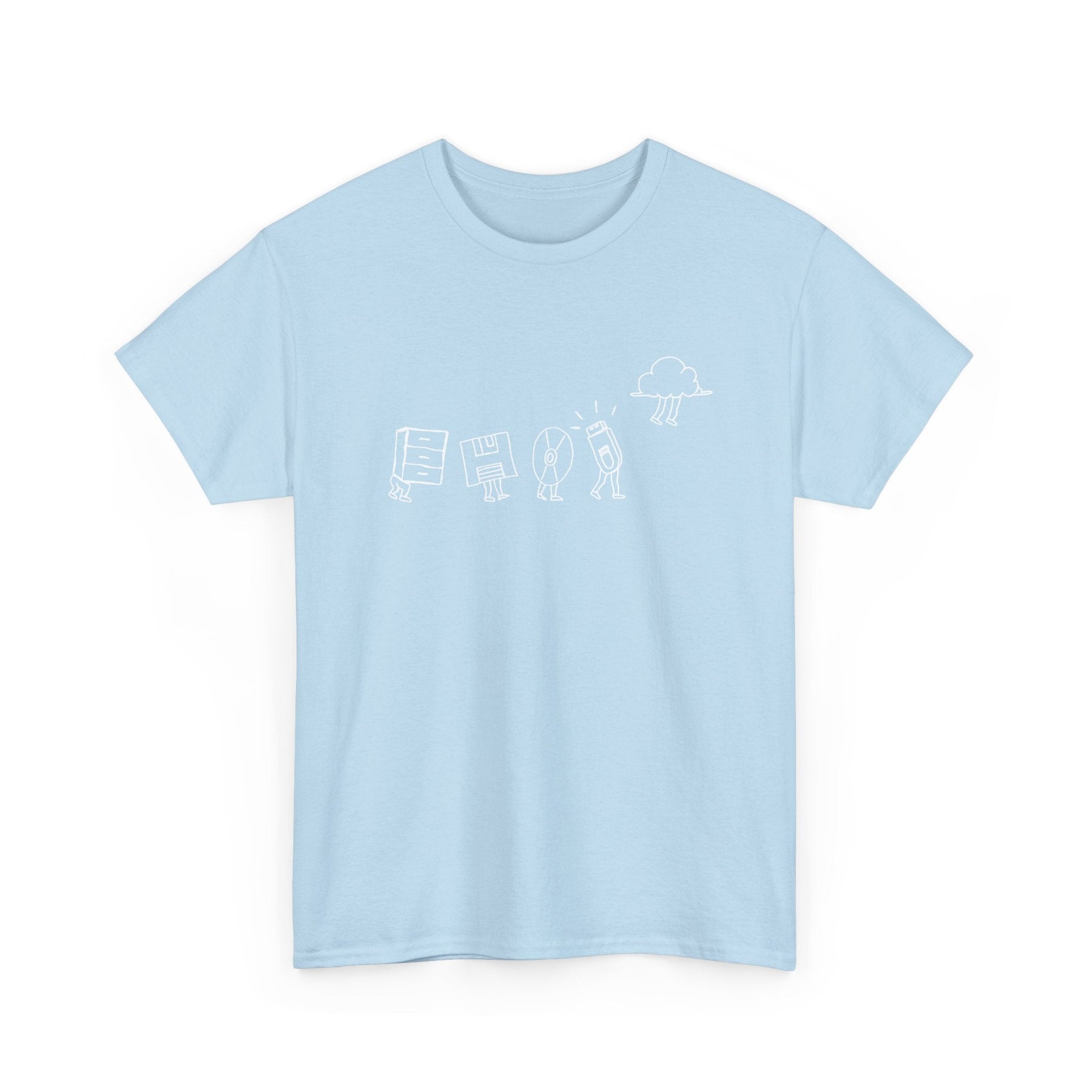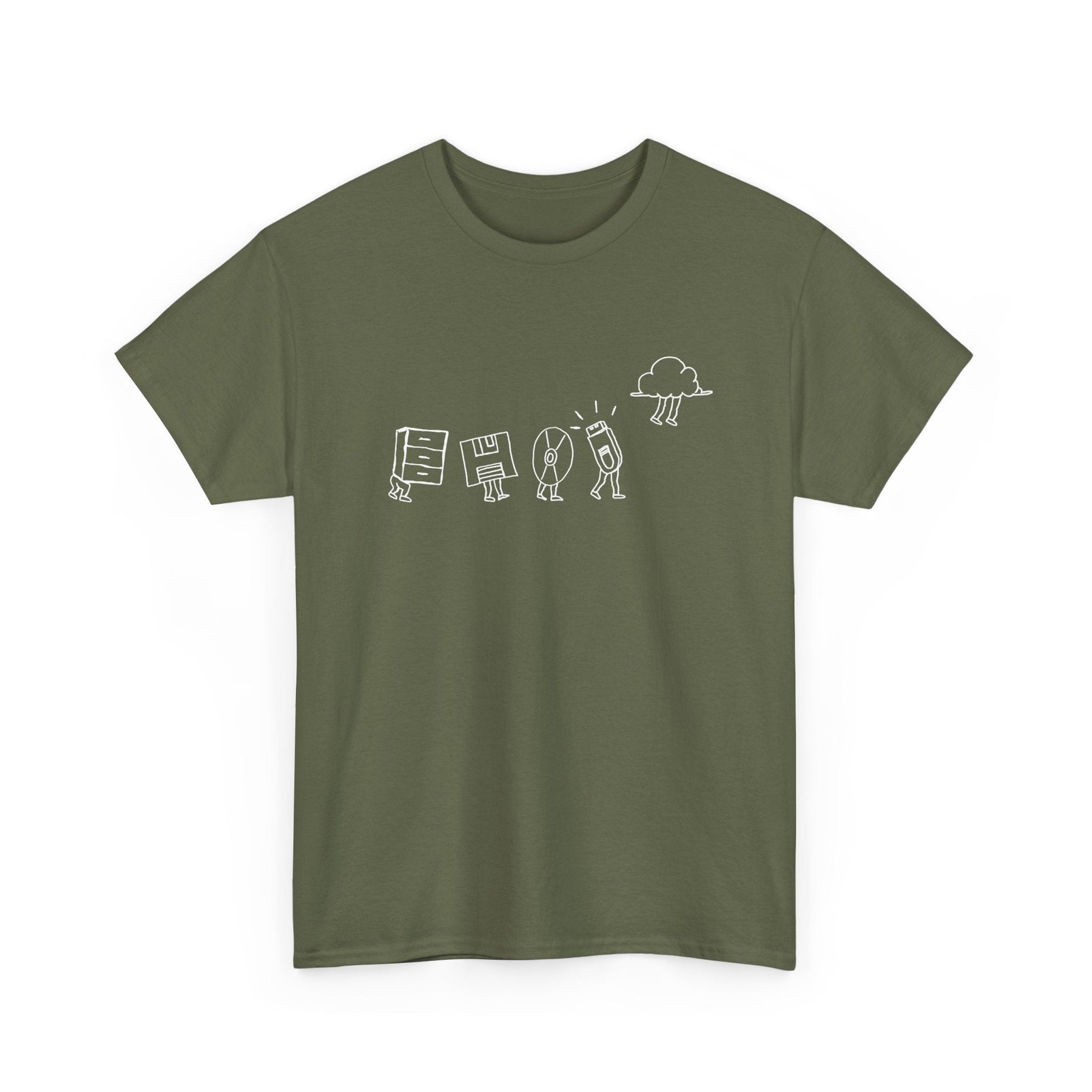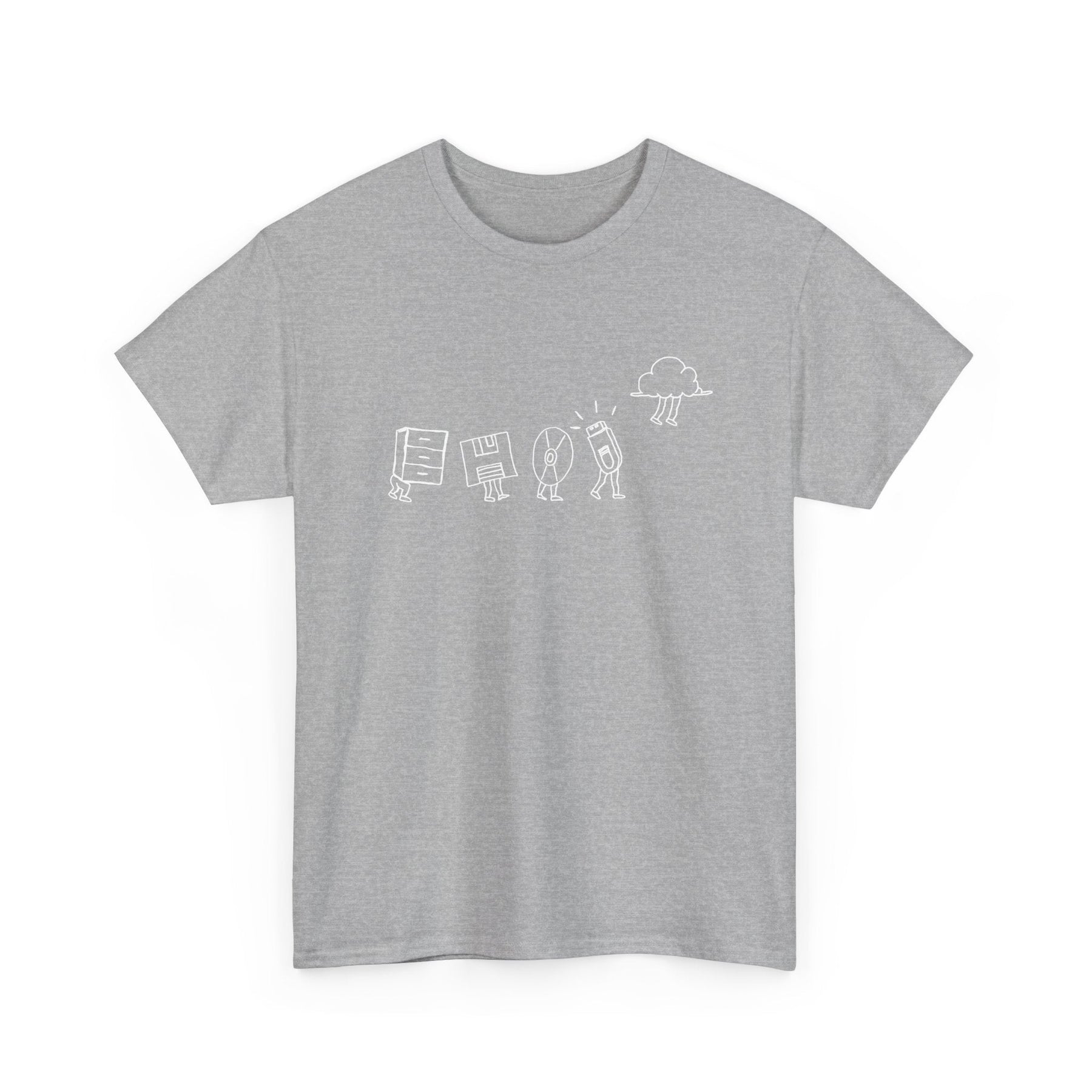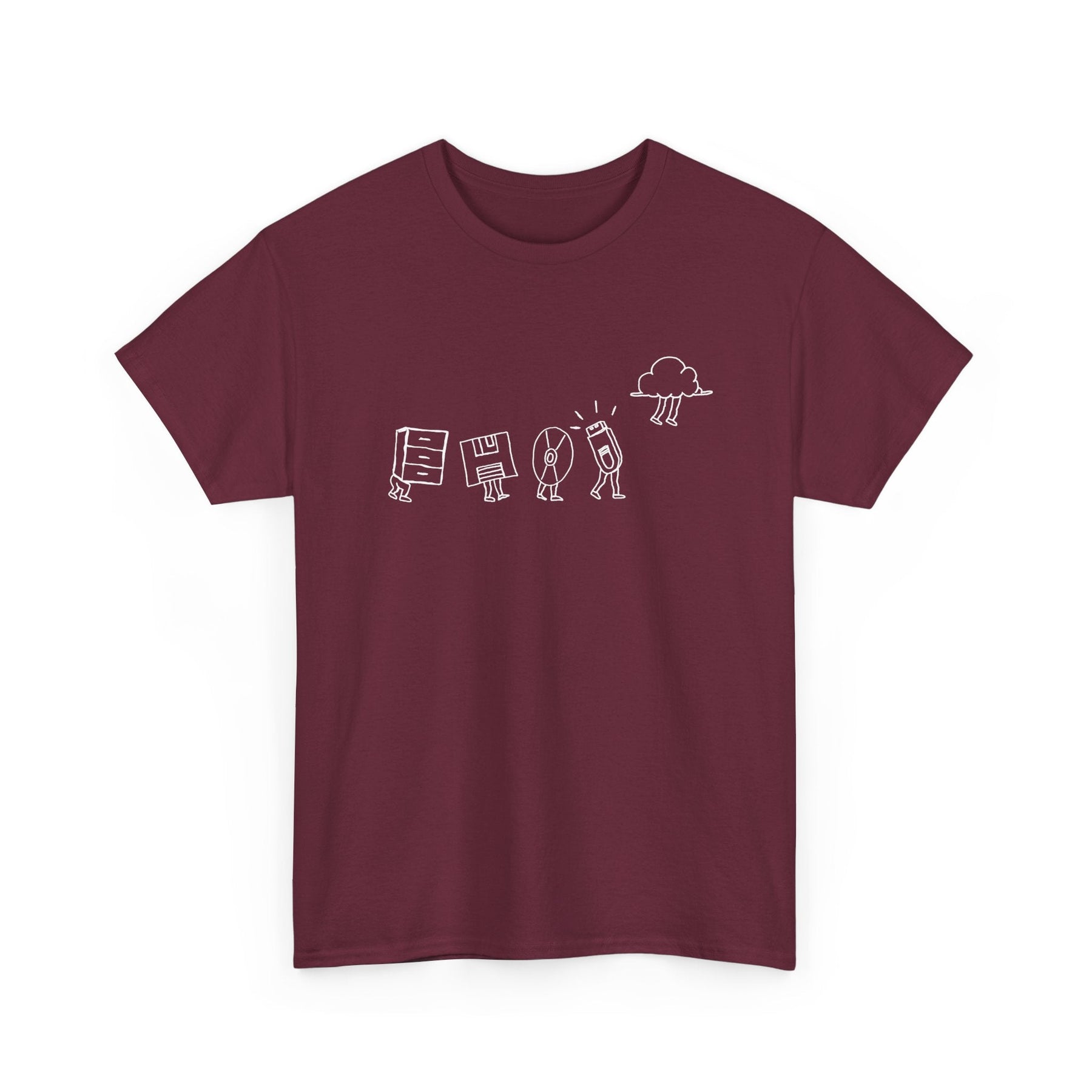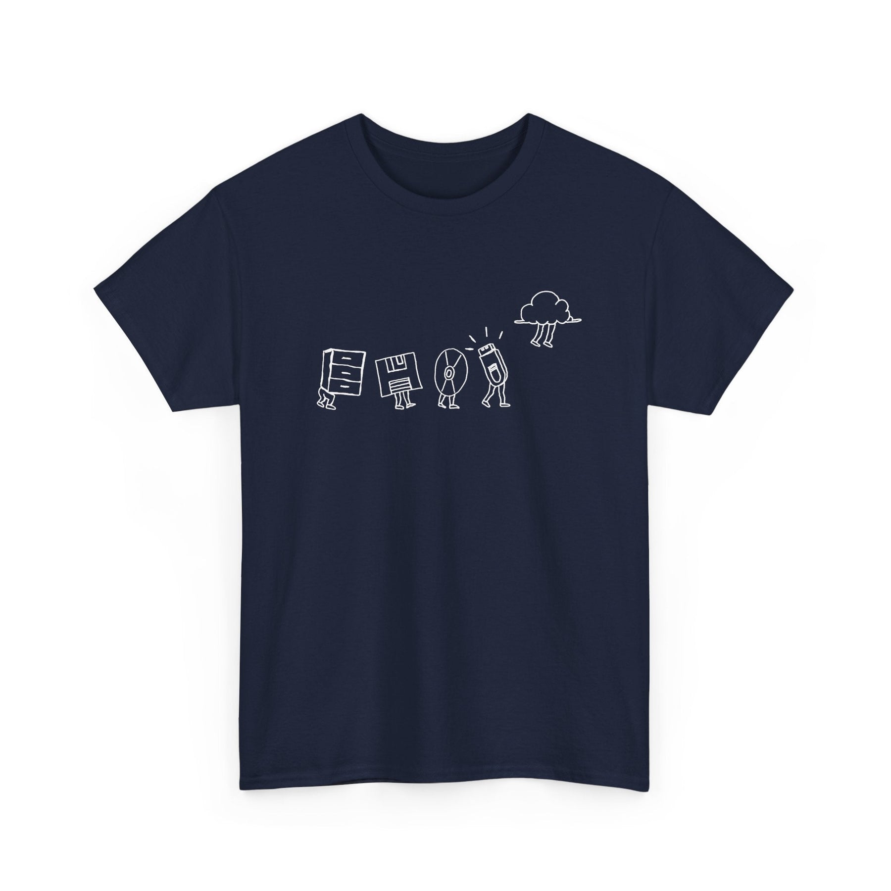 Starting with a classic filing cabinet, the shirt shows the early days of data organization, then moves on to the floppy disk, capturing the era of portable data in its iconic square form. Next up is the CD, a symbol of the leap to optical storage. The progression continues with the sleek and compact thumb drive, showcasing the era of flash storage. Finally, the design culminates with the ethereal cloud symbol, representing the modern age of online storage.