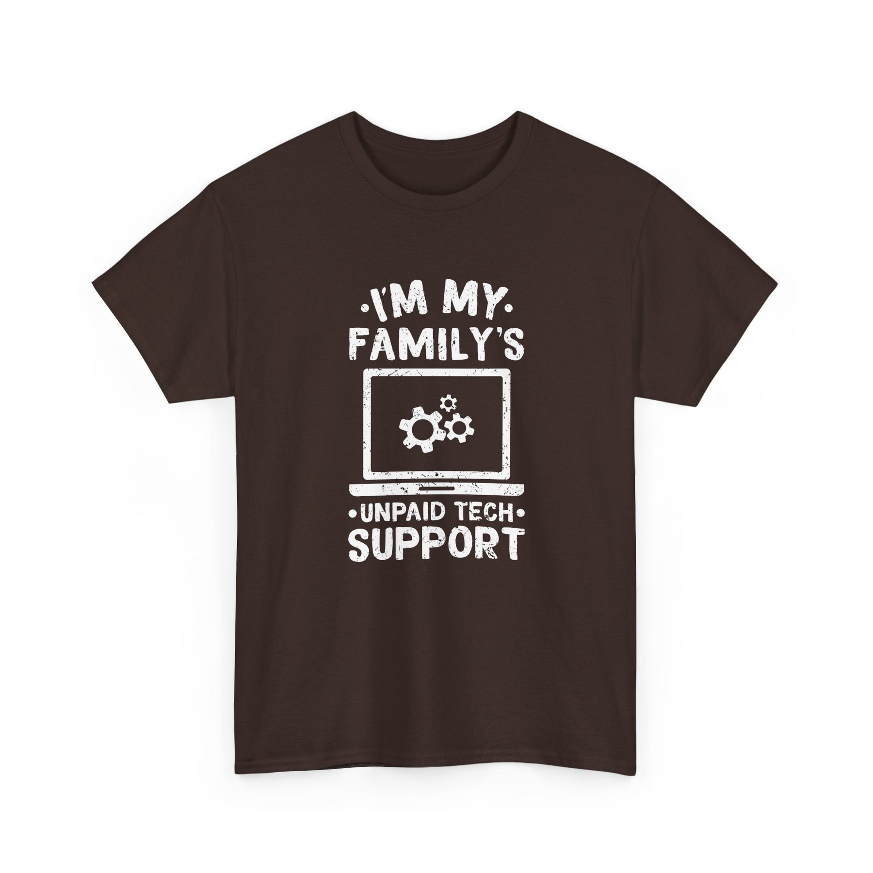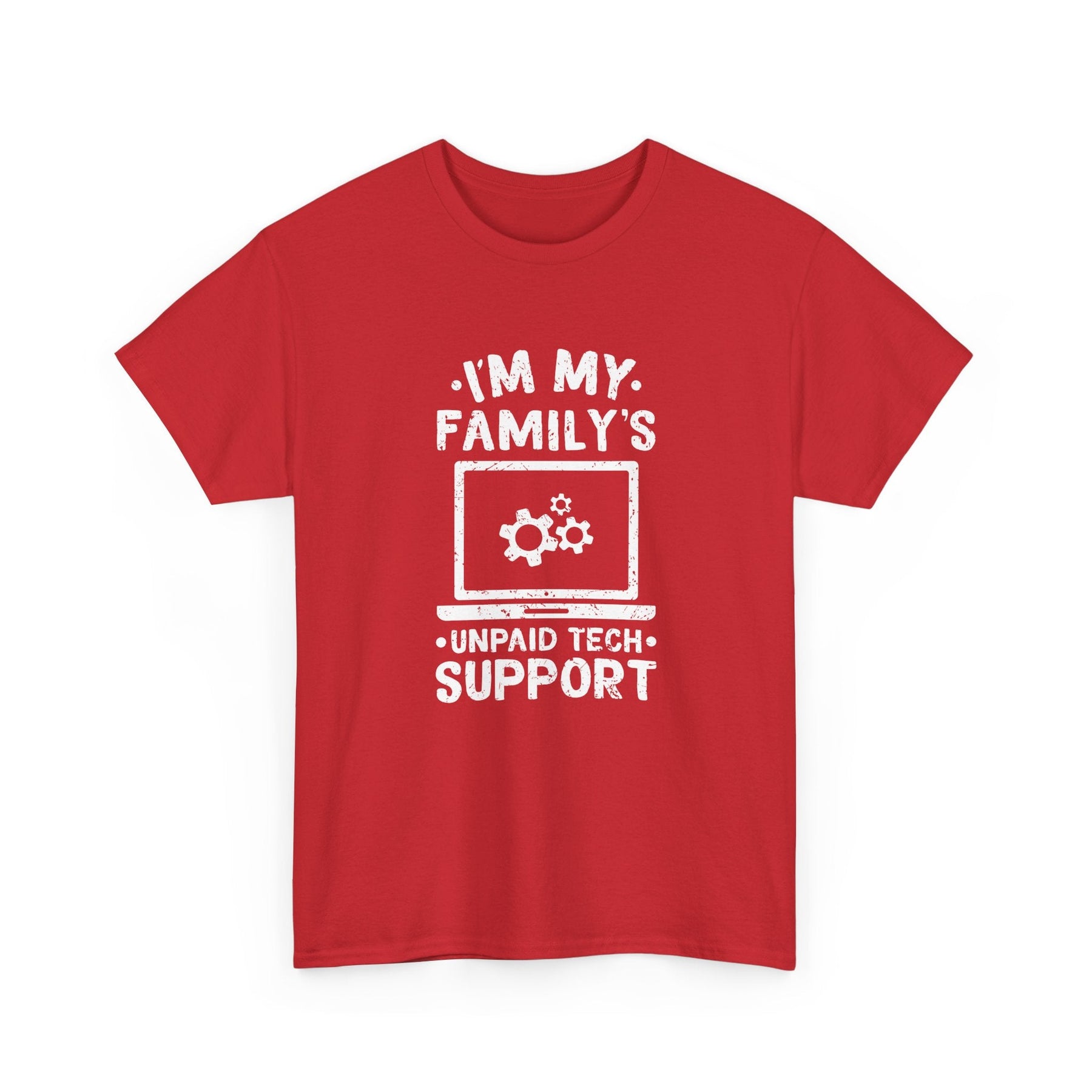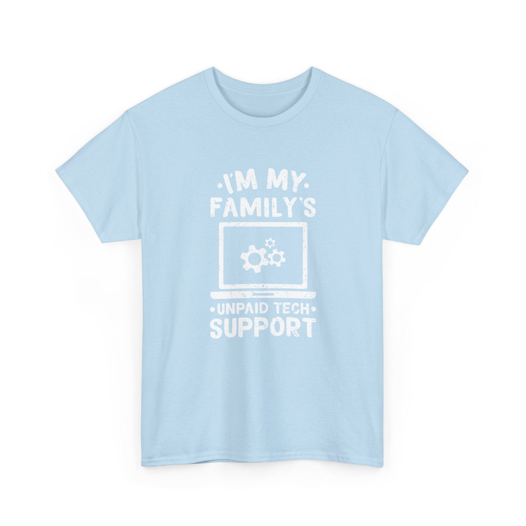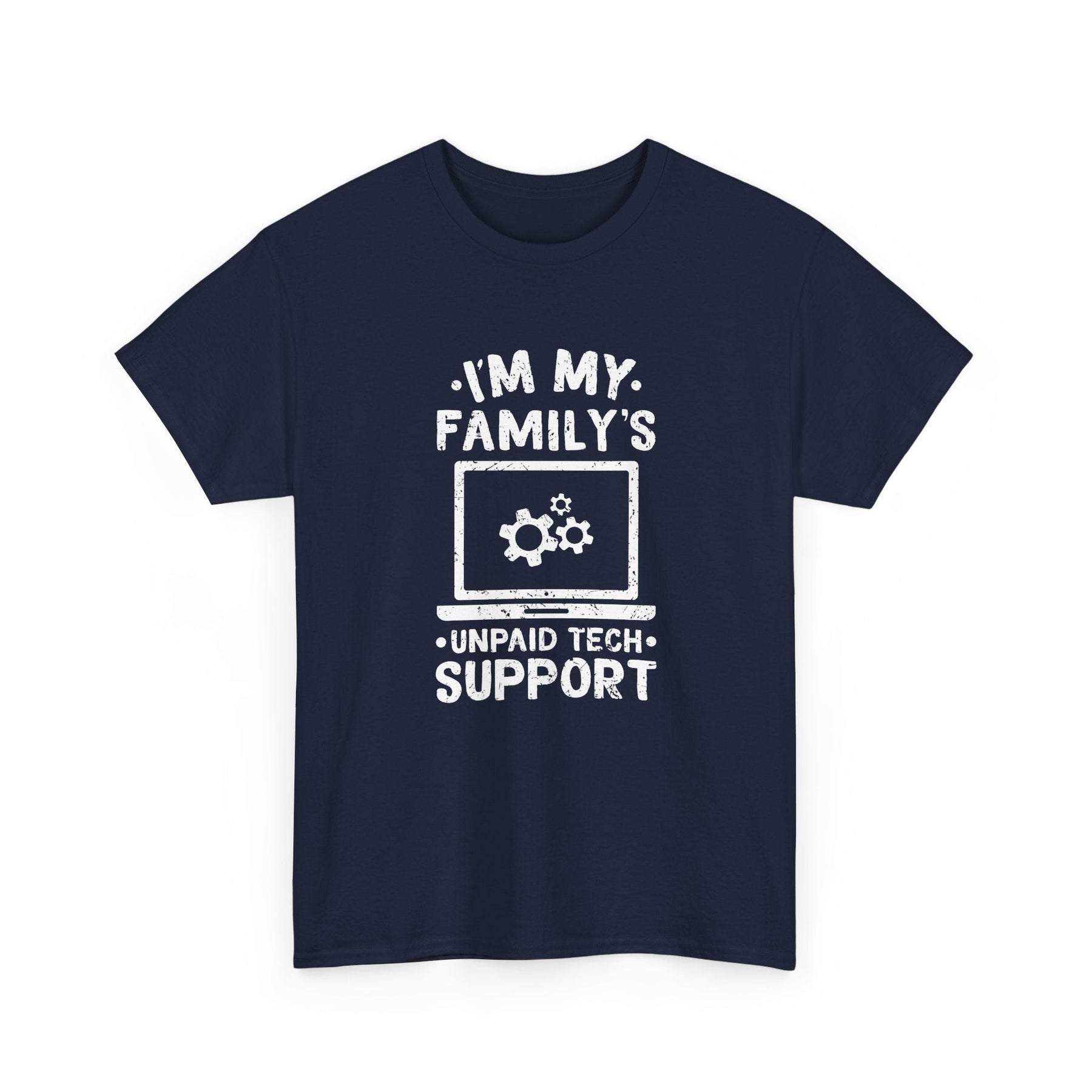 Are you the go-to tech guru in your family? Do you find yourself solving tech problems for free? This T-Shirt is for you! Show off your role as the 'Unpaid Tech Support' with pride. Featuring a humorous design of a laptop with gears, this shirt is perfect for IT enthusiasts, tech support pros, and anyone who's ever been the family's default tech troubleshooter.