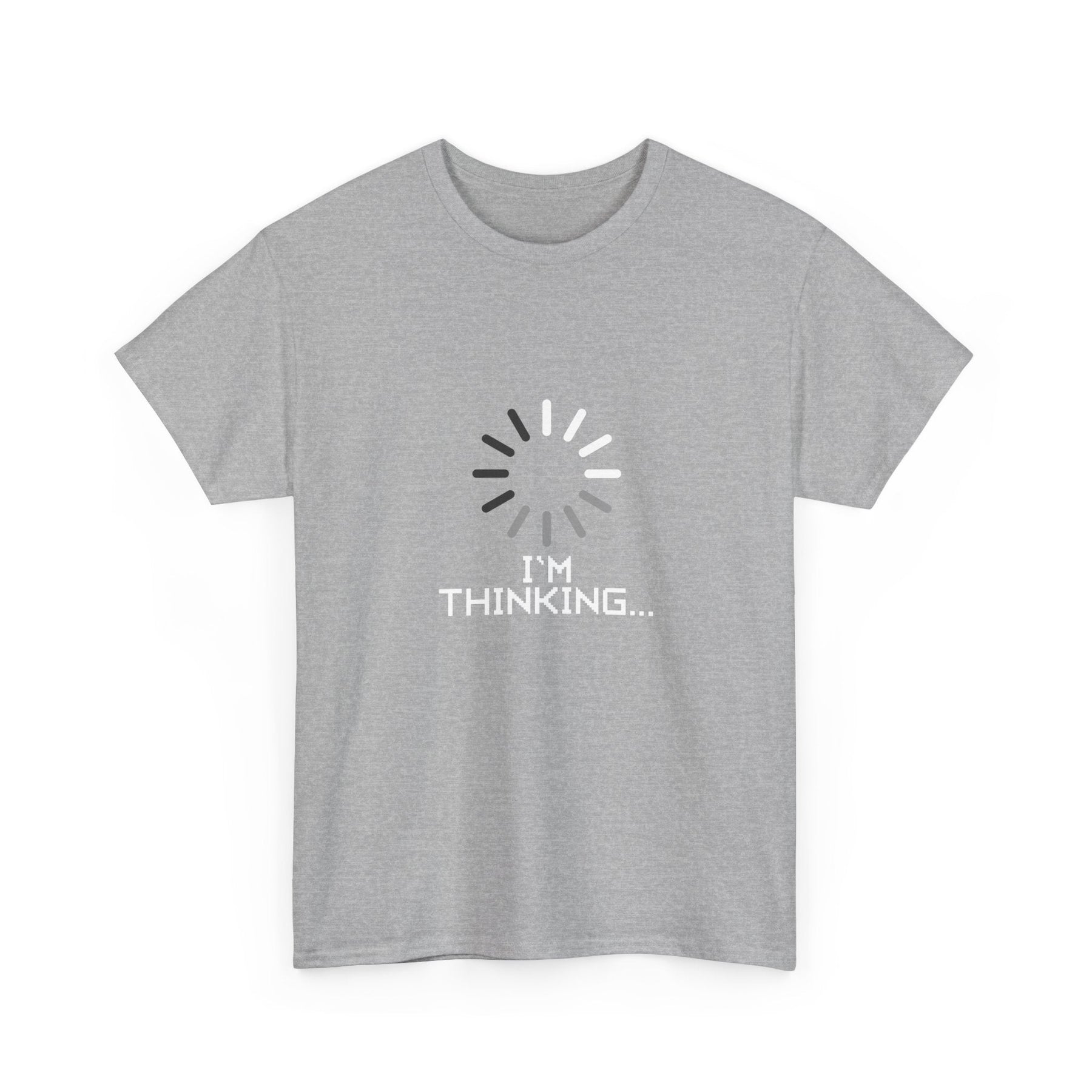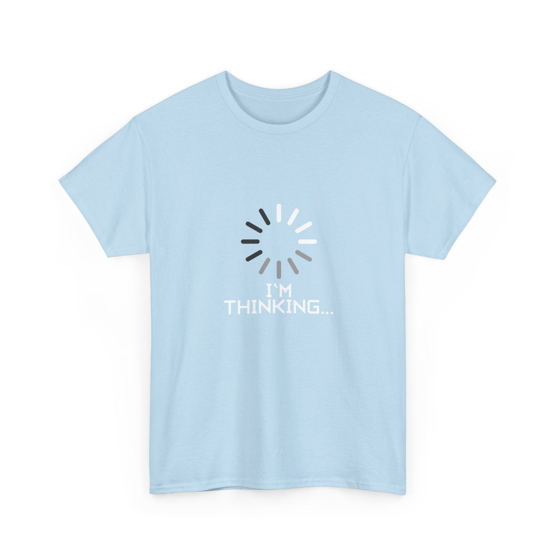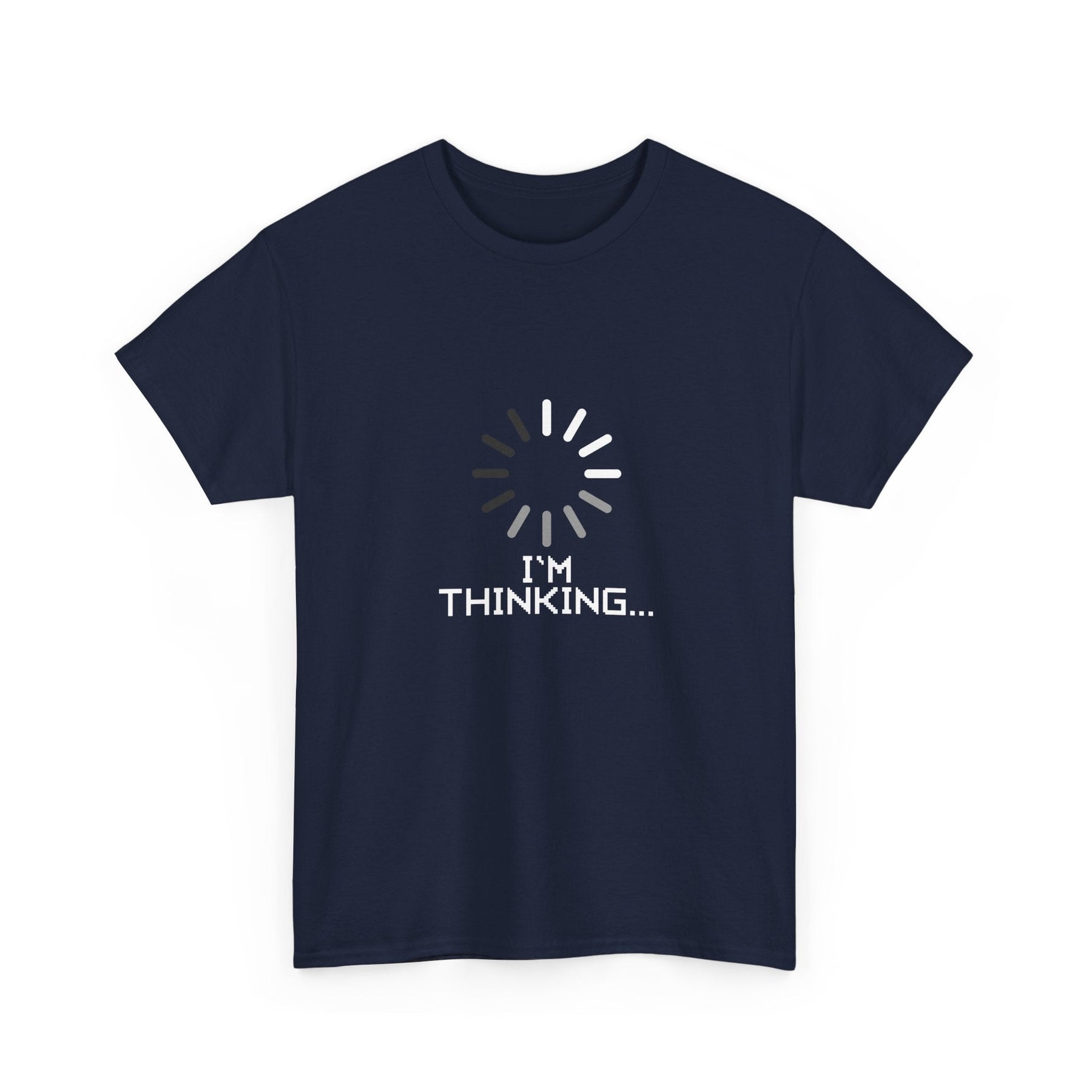 Imagine yourself wearing this shirt, proudly displaying the declaration 'I'm thinking' alongside a whimsical loading wheel design. It's a lighthearted nod to the challenges of technology and the humorous moments that arise when computers struggle to keep up with our demands.