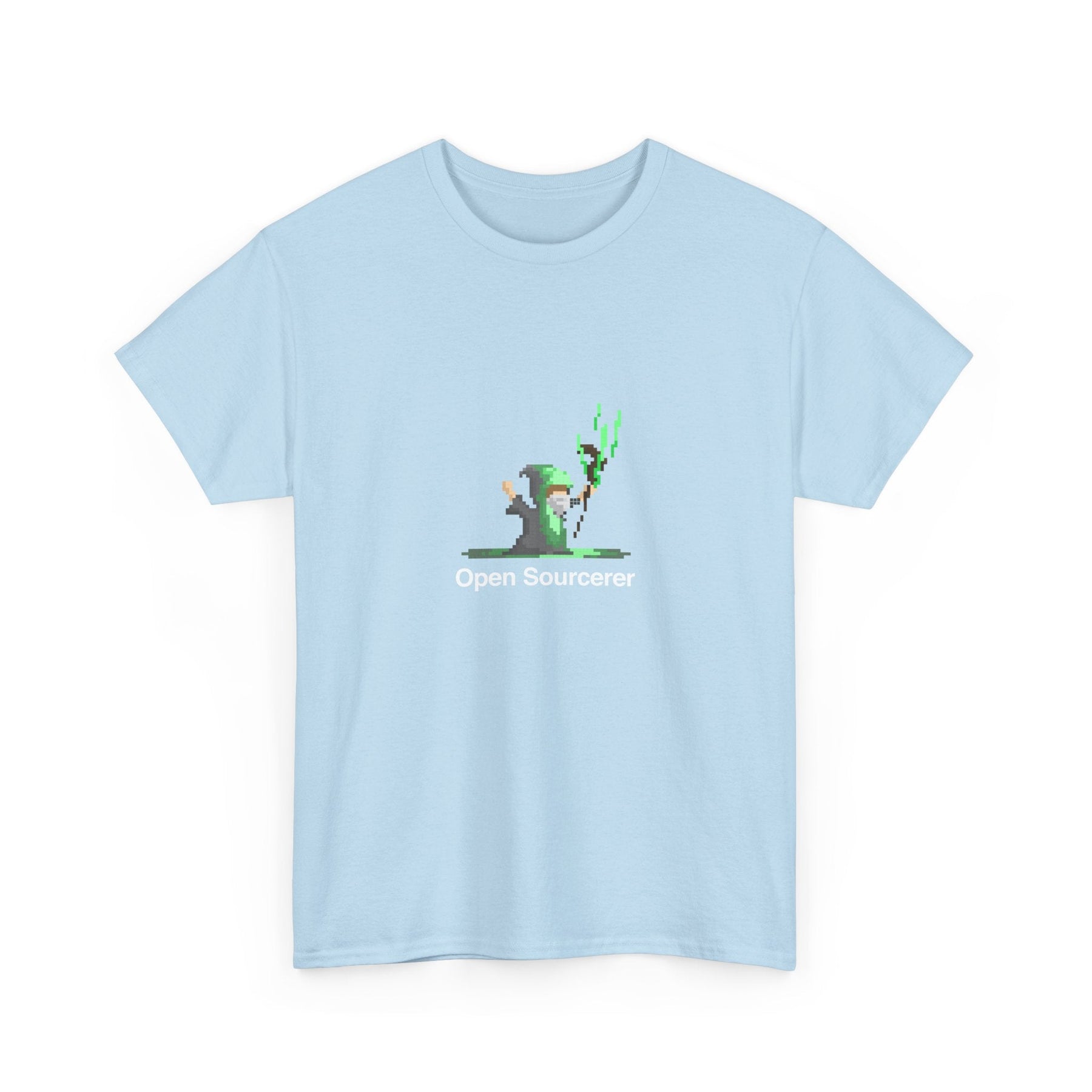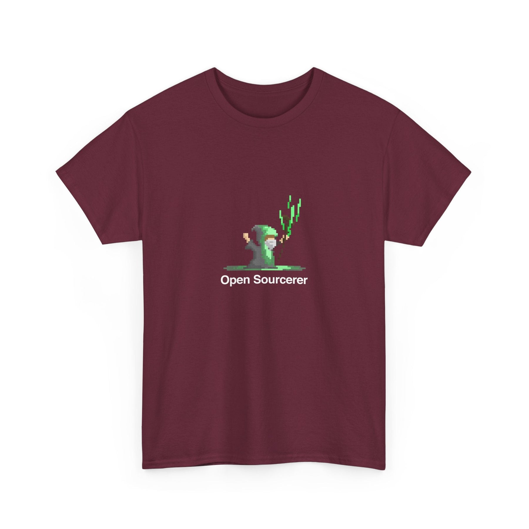 Picture yourself wearing this shirt, proudly displaying the clever declaration 'Open Sourcerer' alongside a charming pixelated sorcerer, complete with wand and spellbook. It's a lighthearted nod to the power of community-driven coding projects and the magic that happens when developers come together to share their knowledge and expertise.