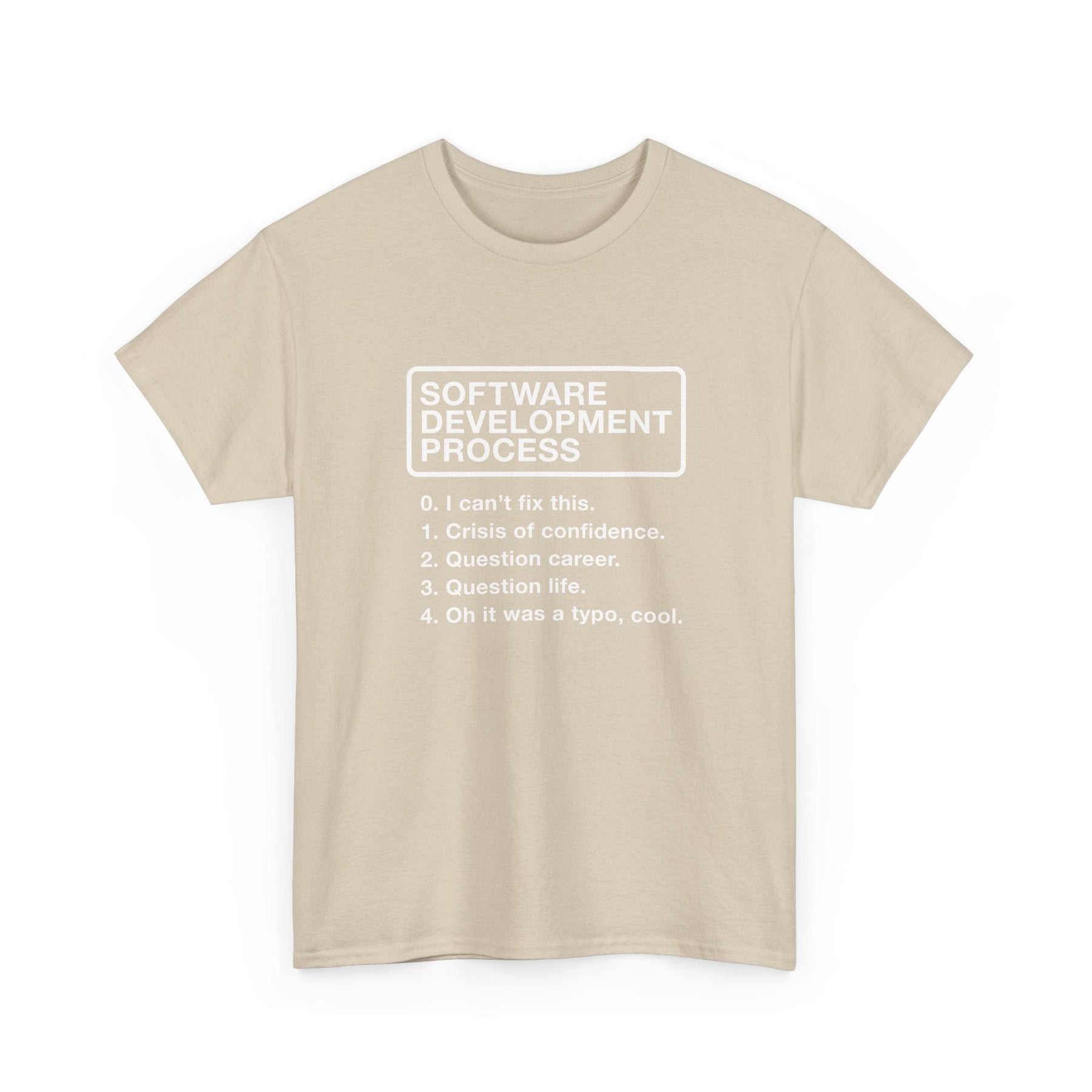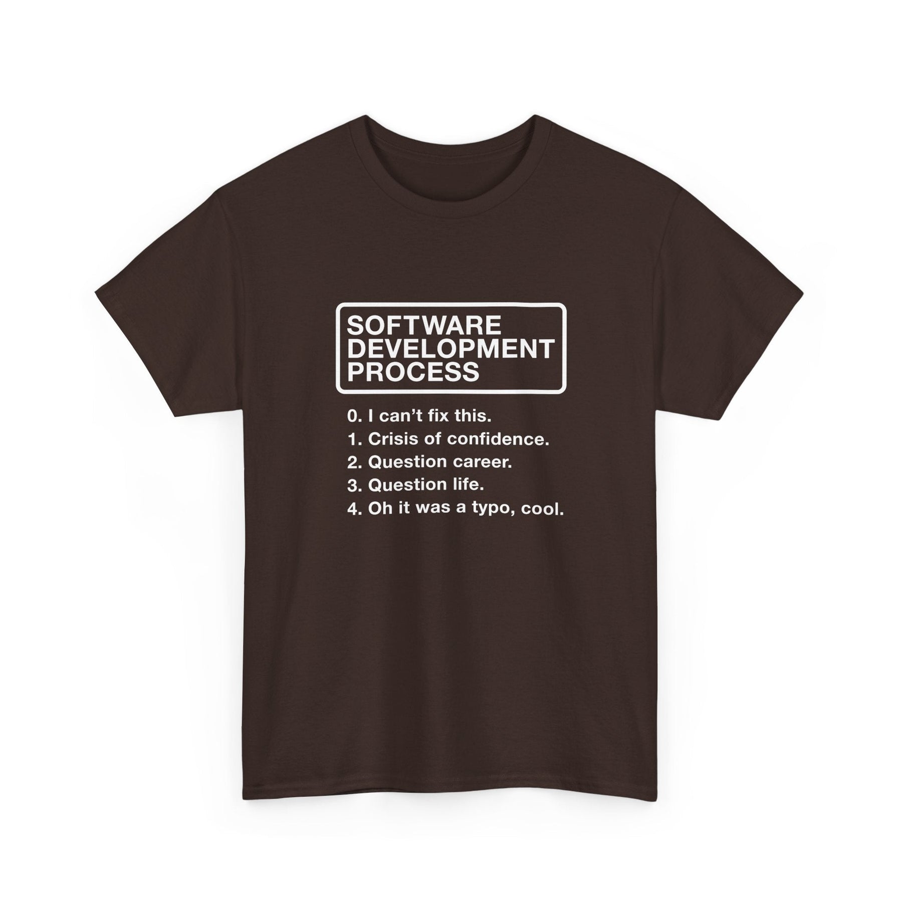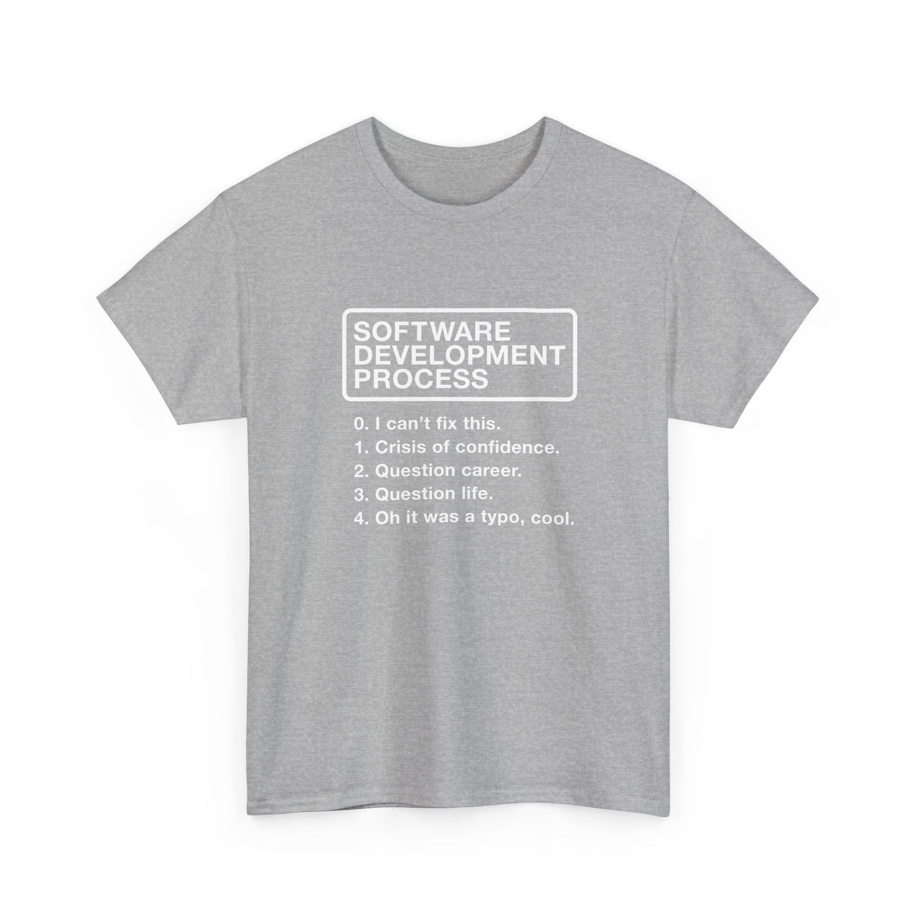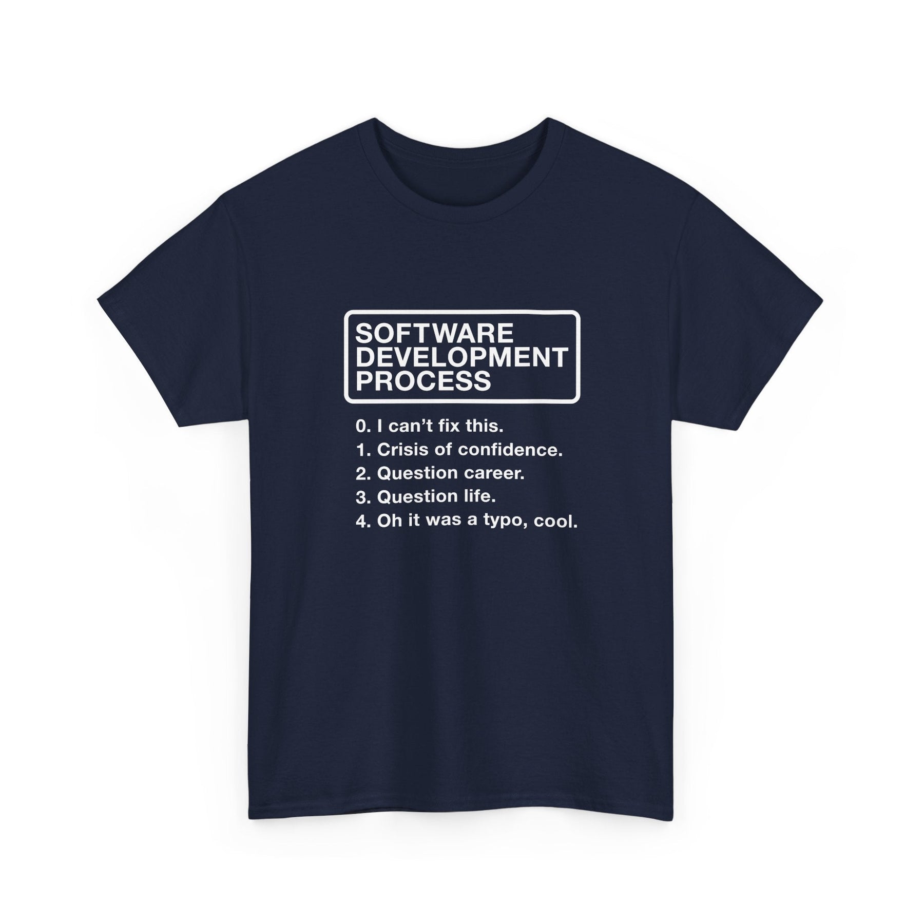 This design uses clean, minimalist typography to deliver a punchline that will resonate with any coder. Centered on the chest, a bold, white, all-caps title, 'SOFTWARE DEVELOPMENT PROCESS,' is enclosed within a simple rectangular border, giving it an air of official procedure. Below the title, a numbered list outlines the steps of this 'process,' presented in a clear, easy-to-read sans-serif font. The stark white-on-black color scheme keeps the focus entirely on the witty text, ensuring the joke lands with maximum impact.